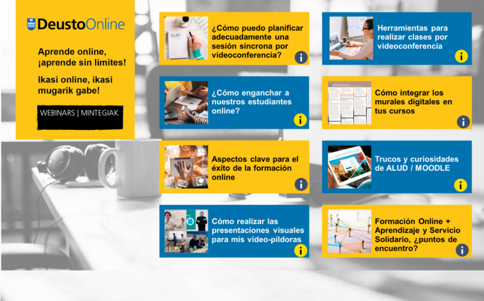 Ikasturte honetan, Deustu Online Unitatetik, egoerara egokitu behar izan dugu, eta online izan gara inoiz baino gehiago. Gure “kafe tertulia”, adibidez, aurrerago utzi ditugu, eta unibertsitateko, ikastetxeetako eta abarretako irakasleentzako on line prestakuntzari buruzko webinar ziklo ireki bat antolatzea erabaki genuen, gure esperientzian zehar taldearengandik ikasi duguna partekatzeko eta pandemiaren ondorioz helarazi dizkiguten zalantza/kezkei erantzuteko modu gisa.