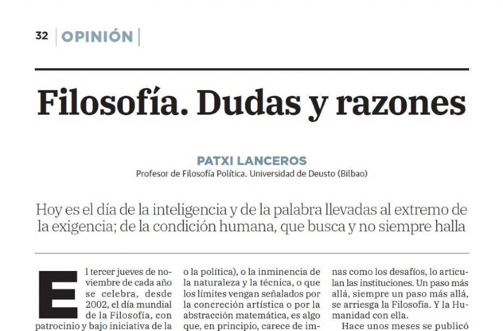 Artículo publicado por Patxi Lanceros en El Correo con motivo del Día Mundial de la Filosofía. .