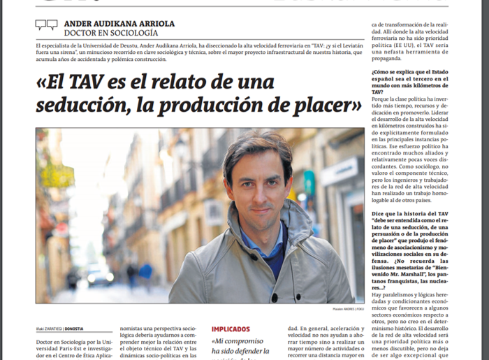 Ander Audikana, Doctor en Sociología en la Université Paris-Est e investigador en el Centro de Ética Aplicada de la Universidad de Deusto, habla en una entrevista publicada en el diario Gara sobre su libro “TAV: ¿y si el Leviatán fuera una sirena”. Audikana analiza la relación entre el objetivo técnico del TAV y las dinámicas socio-políticas en las que nació y se desarrolla el proyecto.