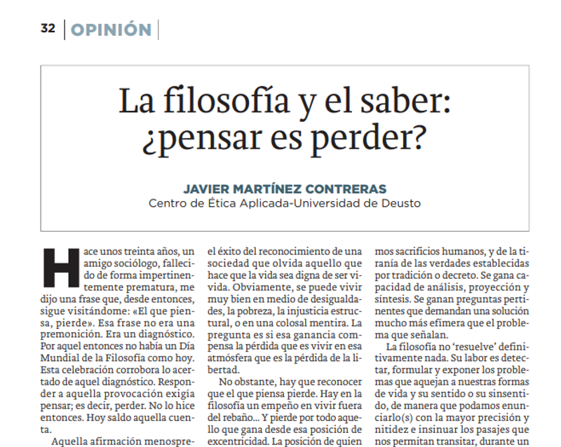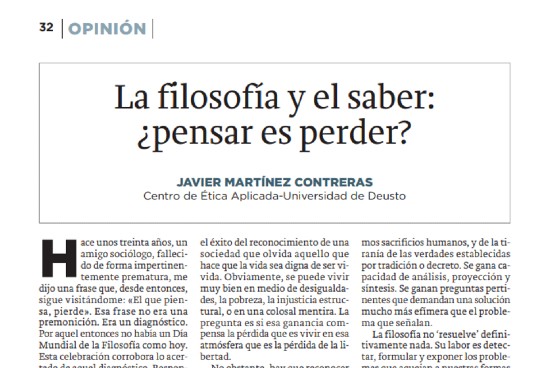«La Filosofía y el saber: ¿pensar es perder?» – Javier Martínez Contreras en El Correo