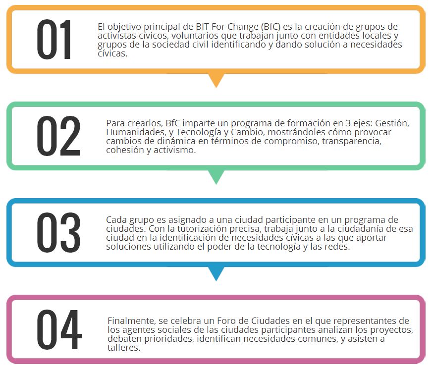 BIT For Change pretende activar personas e incrementar su capacidad de ser agentes de cambio en su comunidad, es una herramienta para la construcción de espacios y dinámicas que impulsen la confianza y acción colectiva. B4C consta de tres fases que se desarrollan de forma consecutiva a lo largo de un período de aproximadamente 4 meses (de abril a julio): la capacitación (pensamiento para el cambio, gestión para el cambio y tecnología para el cambio), la acción y el impacto.