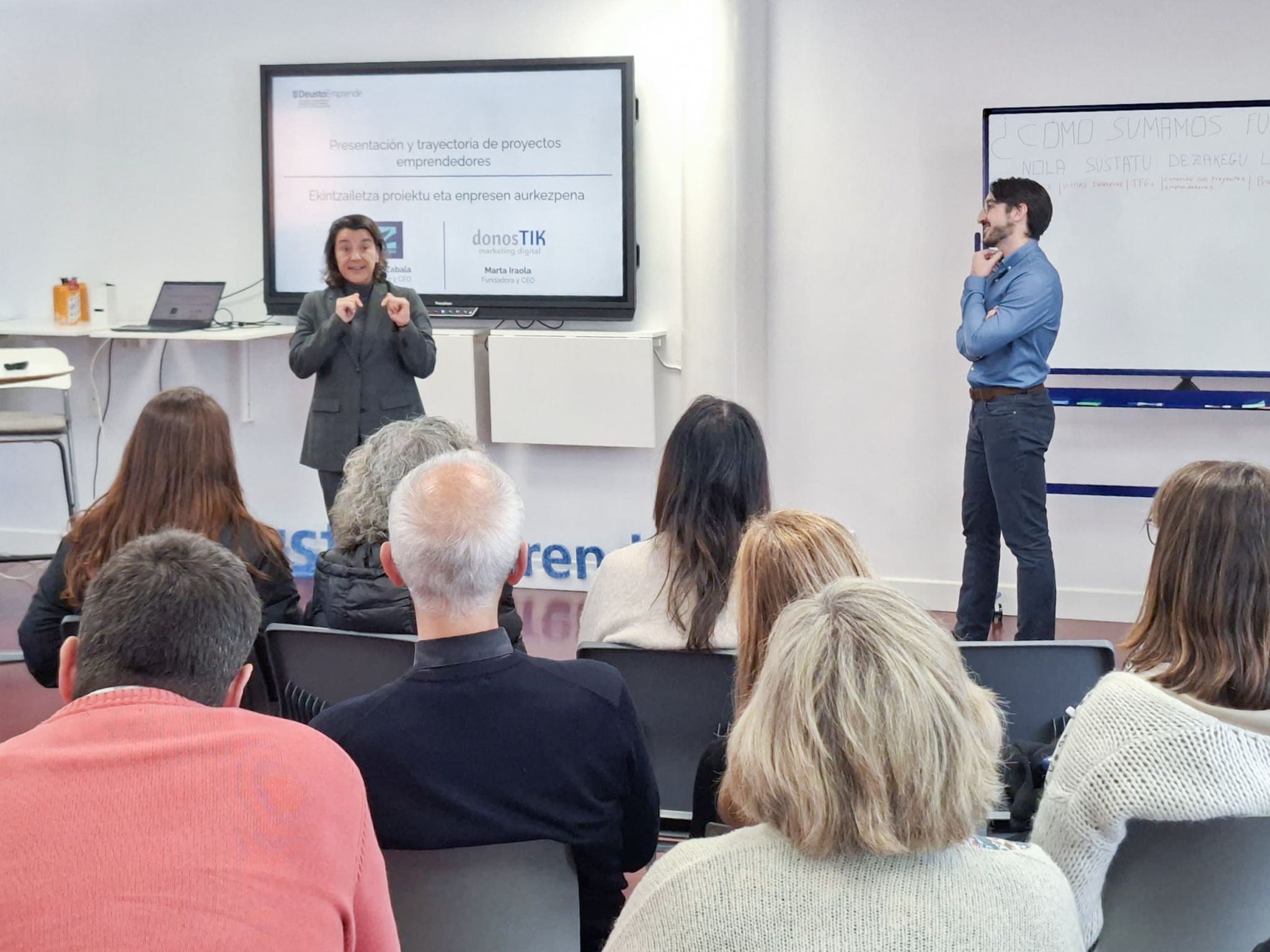 El cierre del evento corrió a cargo de David Zabala Alaba y Marta Iraola, quienes presentaron sus proyectos emprendedores desarrollados con el respaldo de los servicios de acompañamiento de Deusto Emprende. Sus intervenciones sirvieron como inspiración y reflejo del potencial que existe dentro de la propia comunidad universitaria.