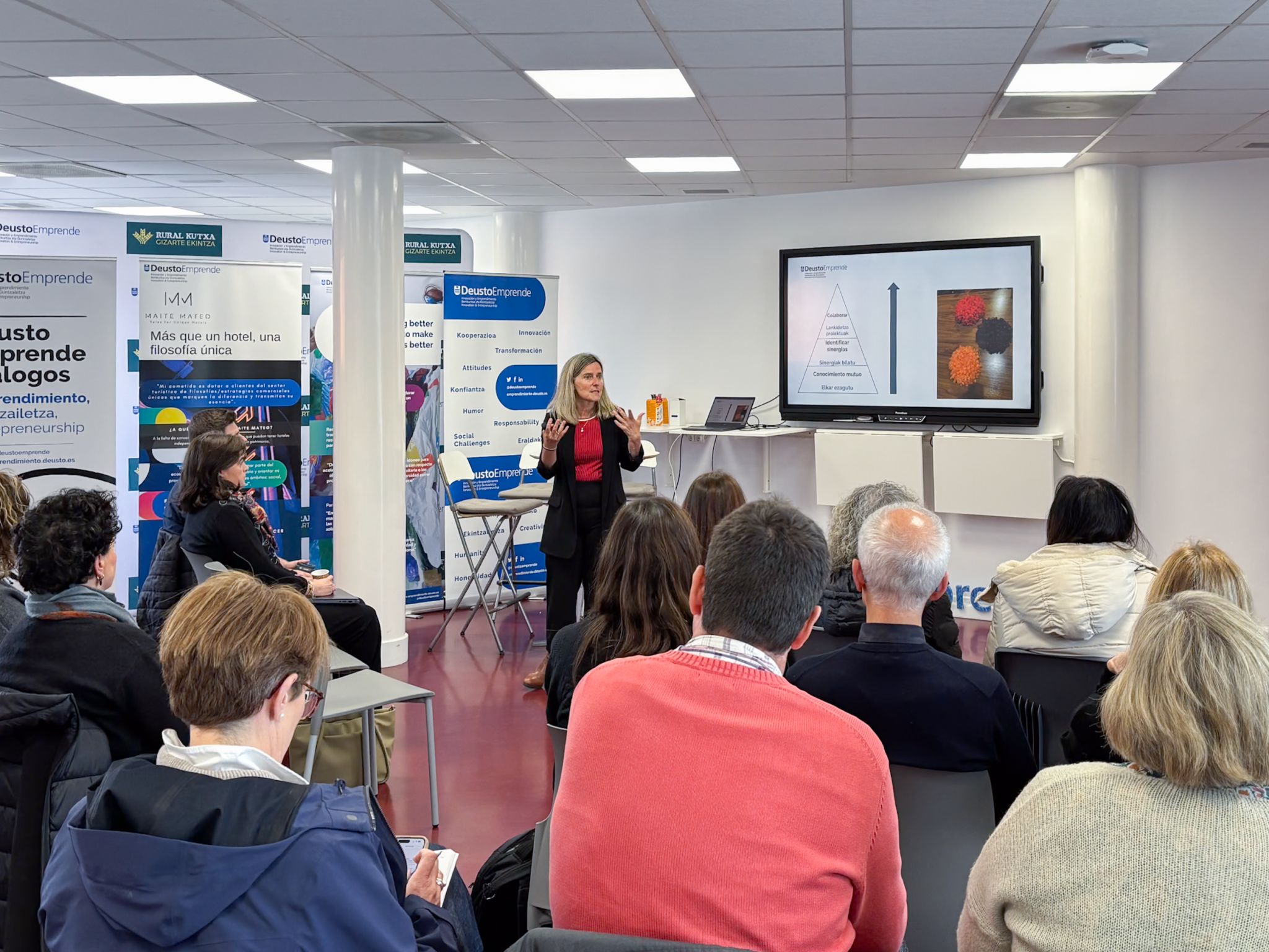 La sesión arrancó con la intervención de Mari Jose Aranguren, vicerrectora del campus de Donostia y de Relaciones Institucionales, quien dio la bienvenida a las personas participantes y subrayó la importancia de fomentar una cultura emprendedora dentro de la comunidad universitaria.