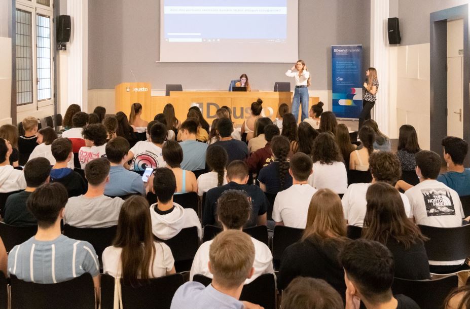 Garbiñe Henry, Universidad de Deustoko berrikuntza eta ekintzailetzako zuzendariak unitatearen aurkezpena egin ondoren, ikasleekin irudimena eta sormena lantzeko dinamika batzuk egin ziren.