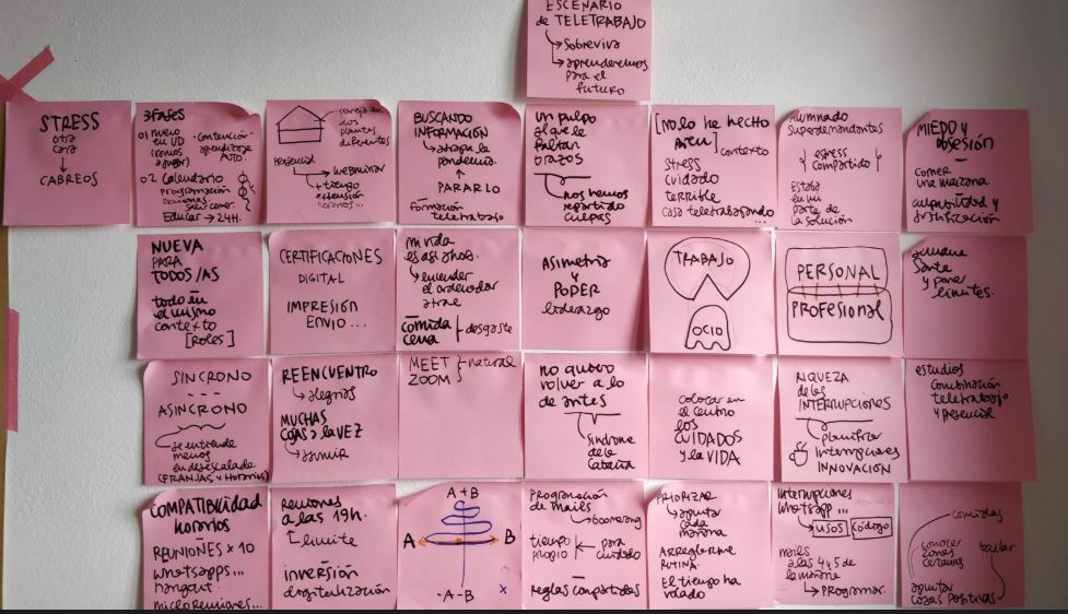 Tras la semana santa impulsamos la iniciativa «La Universidad te cuida!», que pretendía ser el pegamento de talleres, seminarios y formaciones internas en remoto vinculadas directamente a la crisis: gestión de la resiliencia (con Vicente, de Grupo Bentas), comunicación consciente, responsable y saludable (con Nuria Bustamante), gestión del tiempo y prioridades (con Cecilia y Attest), gestión de los riesgos laborales ante el COVID (Mutualia)… o el taller que ayer mismo mantuvimos con Asier Gallastegi acerca de las medidas de cuidado ante el tele-trabajo (una gozada, con un grupo generoso y abierto) cuyos post-its encabezan este texto.