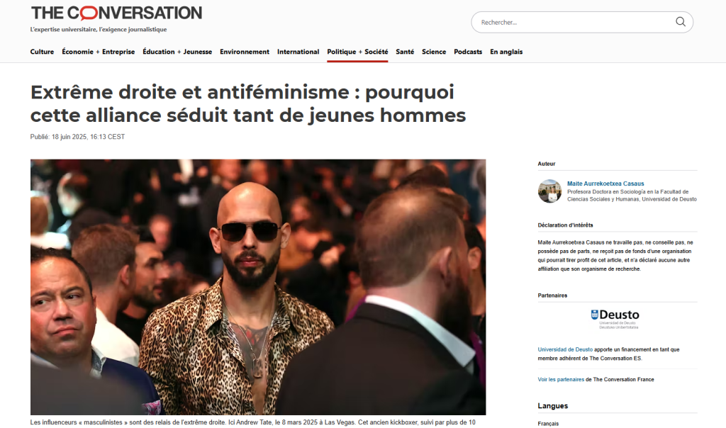 Acabo de publicar un artículo en The Conversation titulado “Extrême droite et antiféminisme: pourquoi cette alliance séduit tant de jeunes hommes?”, donde analizo una tendencia preocupante: el modo en que la ultraderecha está captando a parte de la juventud, especialmente a los hombres, mediante discursos antifeministas.