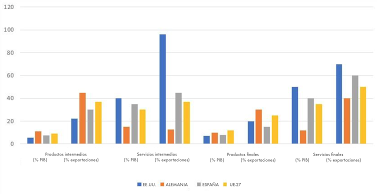 Si miramos las actividades manufactureras como parte de las economías, EE. UU. se queda atrás con respecto a la UE-27, Alemania y España, ya sea en bienes intermedios o finales, o vista su producción como porcentaje del PIB o de las exportaciones totales.