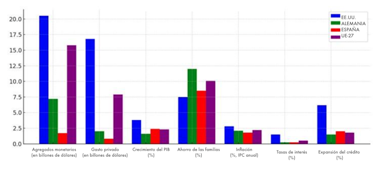 Para comparar la situación europea con la estadounidense, la OCDE, la Reserva Federal, el Banco Central Europeo, la Oficina de Análisis Económico de EE. UU. (Bureau of Economic Analysis, BEA) y Eurostat proporcionan datos relevantes para calcular el crecimiento del PIB nominal, los agregados monetarios, las tasas de ahorro de los hogares, el gasto en consumo privado, los niveles de inflación, los tipos de interés y la expansión crediticia. Al analizar estos indicadores, emergen diferencias notables entre ambas economías entre 2019 y 2023.