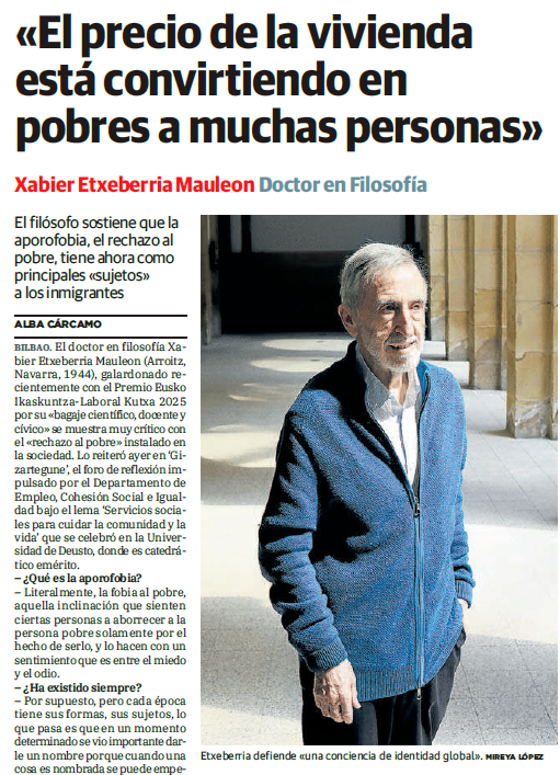 El doctor en filosofía Xabier Etxeberria Mauleon (Arroitz, Navarra, 1944), galardonado recientemente con el Premio Eusko Ikaskuntza-Laboral Kutxa 2025 por su «bagaje científico, docente y cívico» se muestra muy crítico con el «rechazo al pobre» instalado en la sociedad. Lo reiteró ayer en ‘Gizartegune’, el foro de reflexión impulsado por el Departamento de Empleo, Cohesión Social e Igualdad bajo el lema ‘Servicios sociales para cuidar la comunidad y la vida’ que se celebró en la Universidad de Deusto, donde es catedrático emérito.