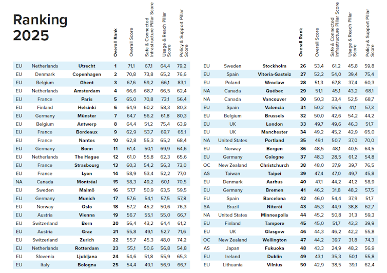 En los rankings internacionales, como el Copenhagenize Index, las posiciones en cabeza de ciudades amigas de la bicicleta están dominadas por urbes como Copenhague, Ámsterdam, Utrecht, París y Viena.